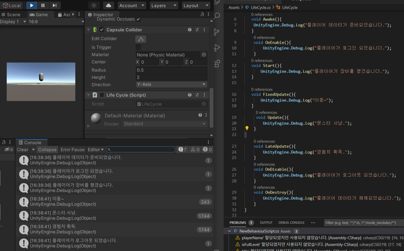 OnDestroy: 게임 오브젝트가 삭제직전에 무언가 남기고 삭제된다 <게임 오브젝트는 삭제하지 않고 켜고 끌수도 있다.