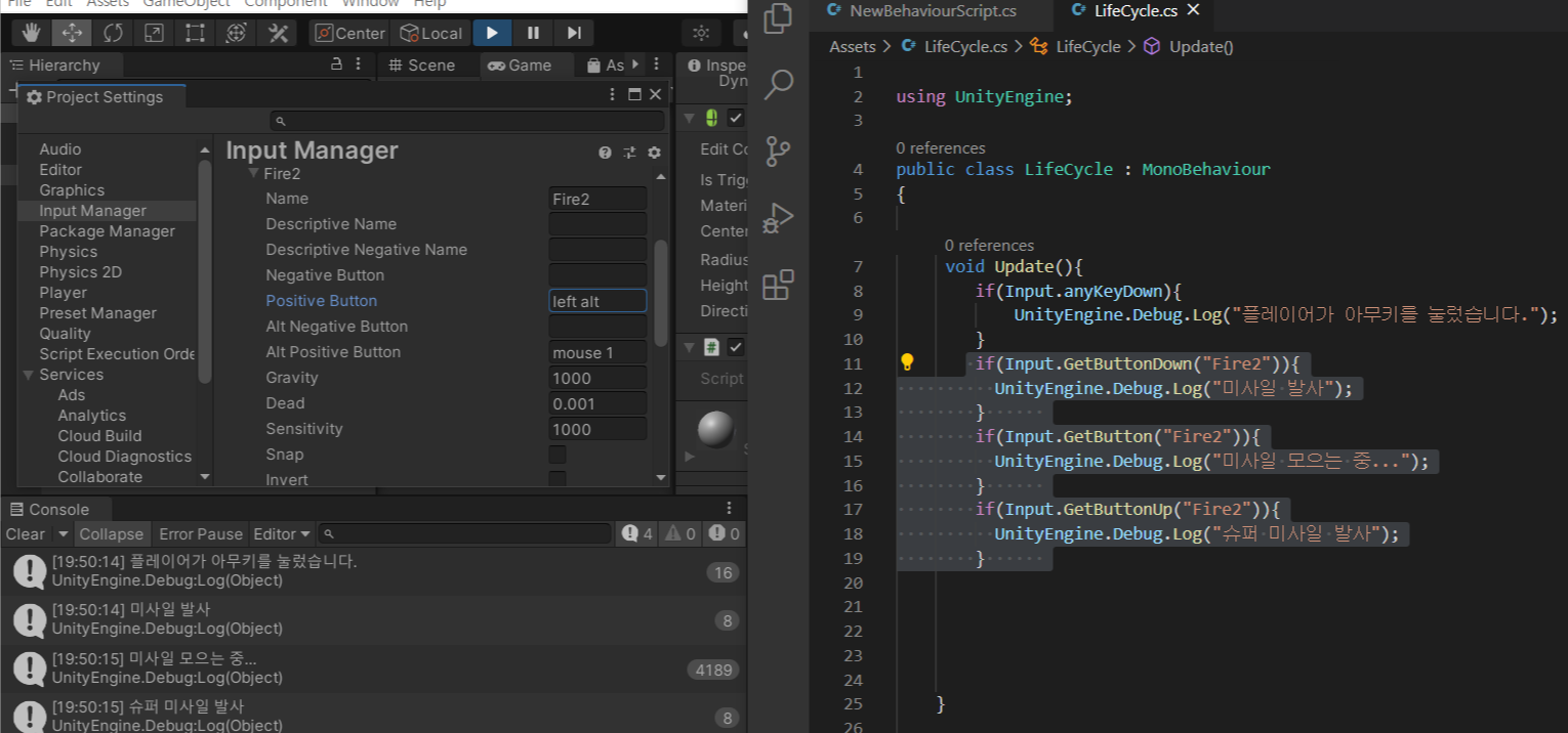 - 유니티에서 공식적으로 지정해준 키로 작동하도록 하는 방식으로 유니티도구의 Input Manager에서 버튼설정!