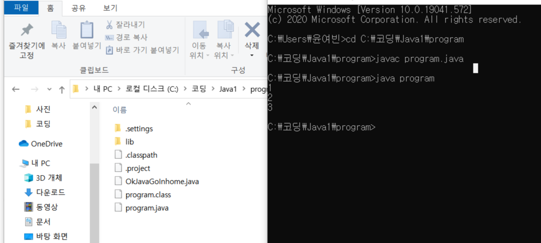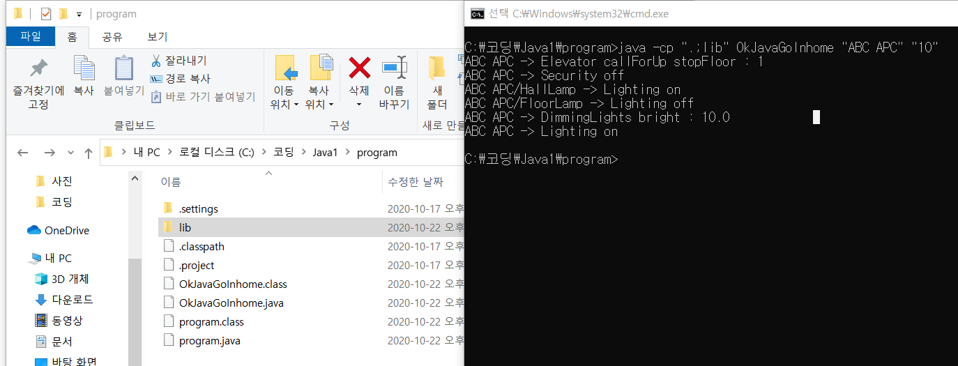 (자바 컴파일러야 class들이 어디있는지 .(현재디렉토리) ;(안에 있는) lib(lib 디렉토리)에서 찾아봐라 그리고 OkJavaGoInhome.java 를 컴파일 해라)