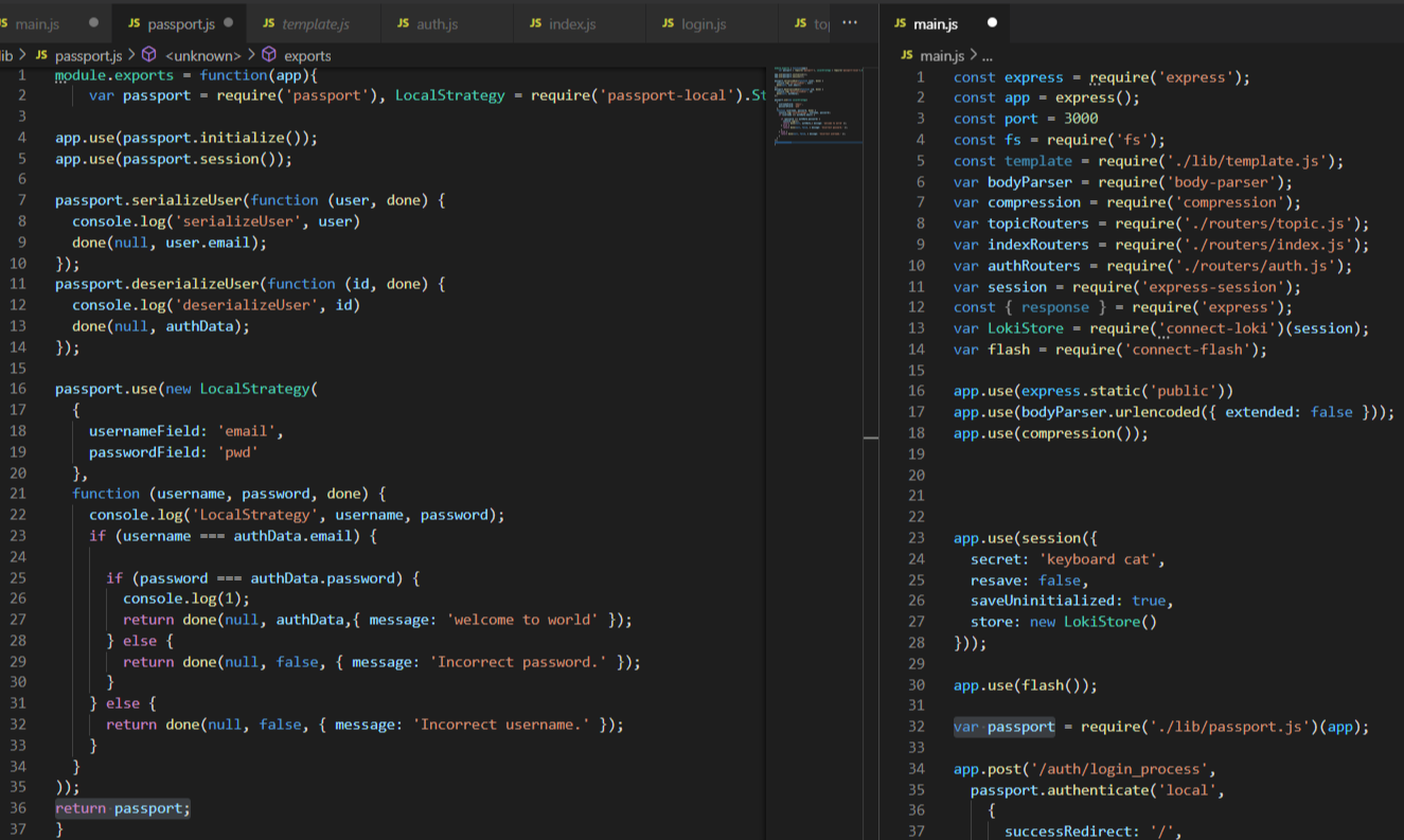 (3) - main.js와 연동시키기위해 require('./lib/passport.js') 그리고 모듈파일인 passport.js를 함수로써 exports했기때문에