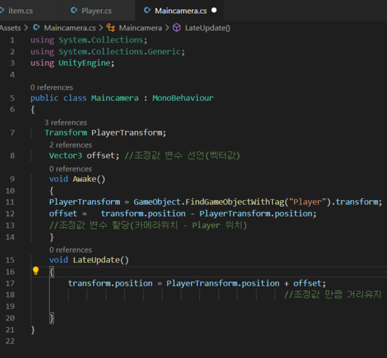 (2)- 카메라와 Player 오브젝트의 위치가 같도록 Maincamera 스크립트 작성