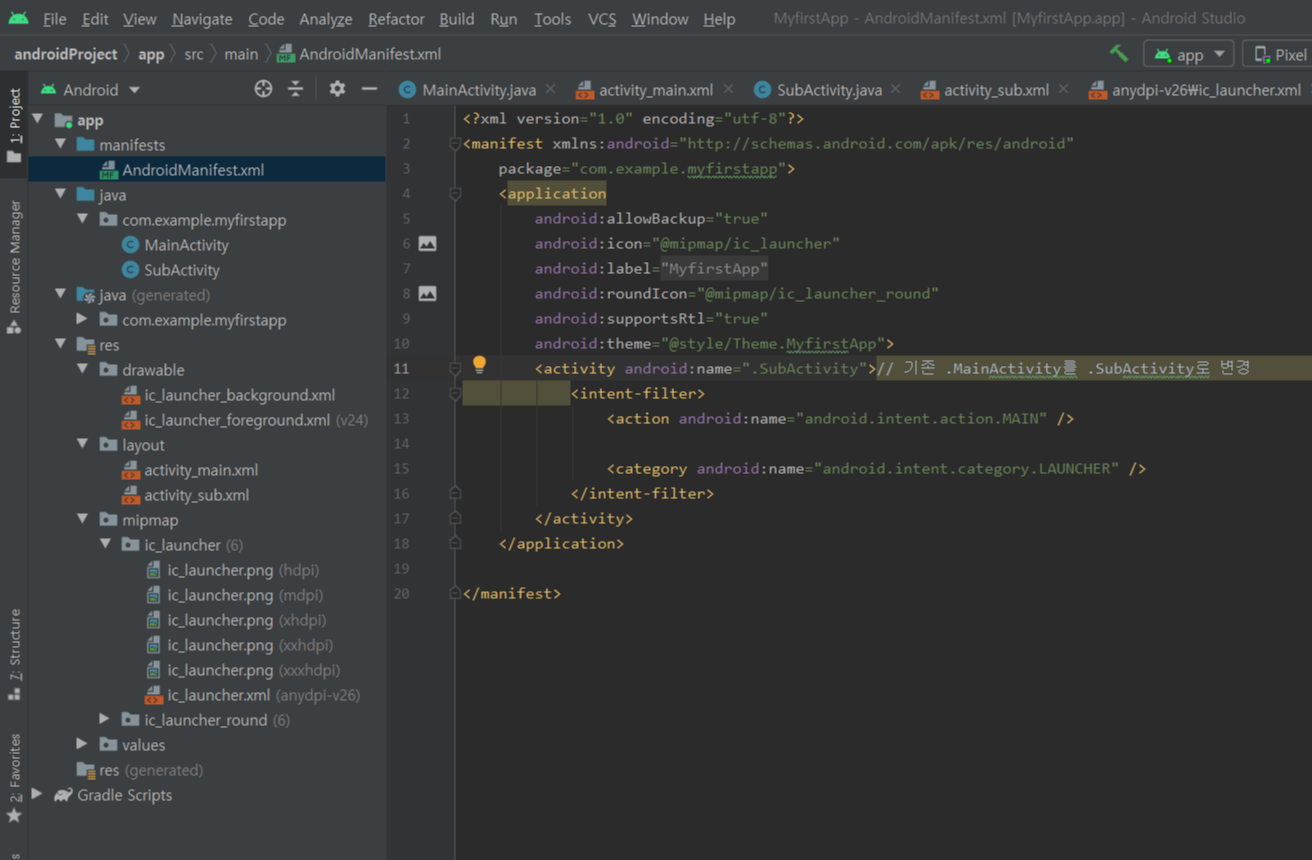 (2) - 안드로이드메인페스트 환경설정에서 위에서 만든 파일을 실행토록 변경