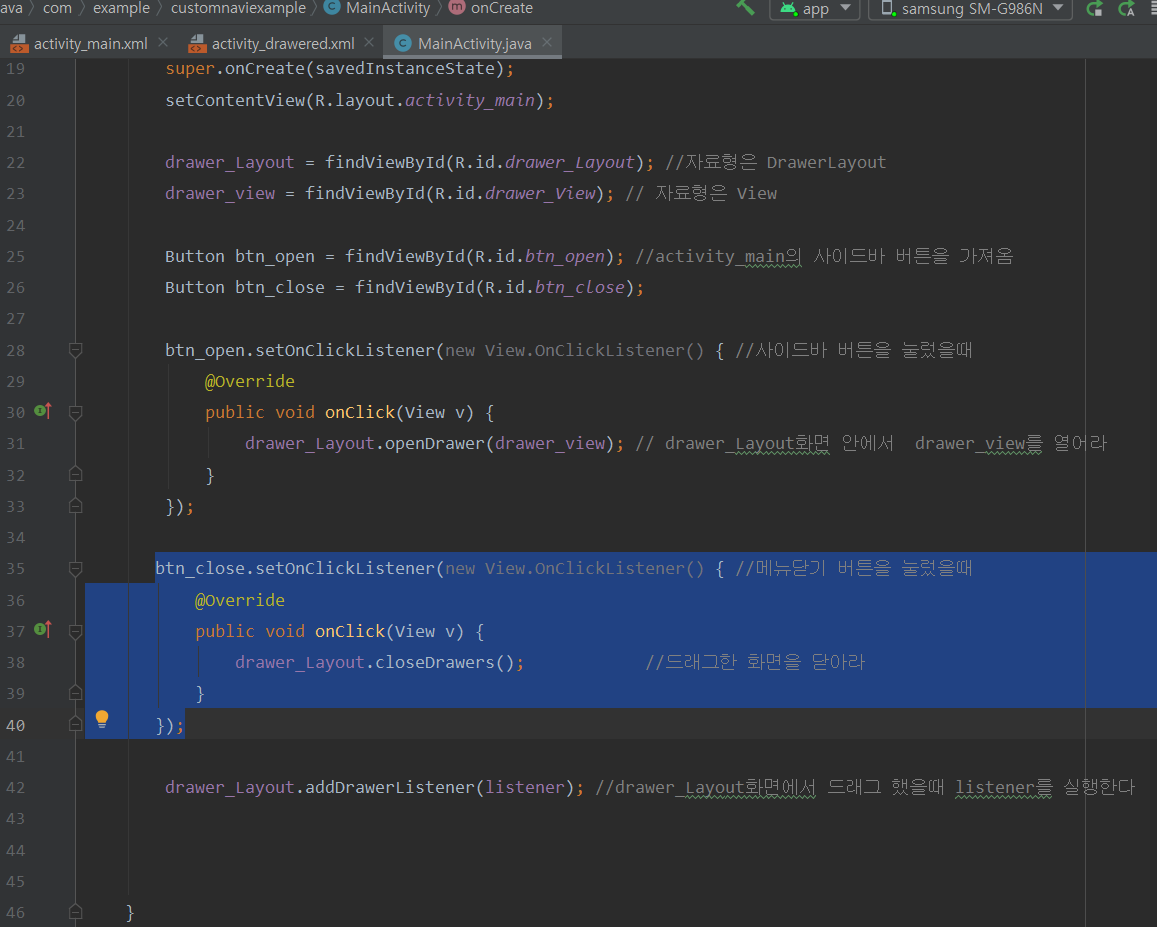 1.activity_main에 DrawerLayout(위에 그림을 그릴 바탕이되는 레이아웃) 생성