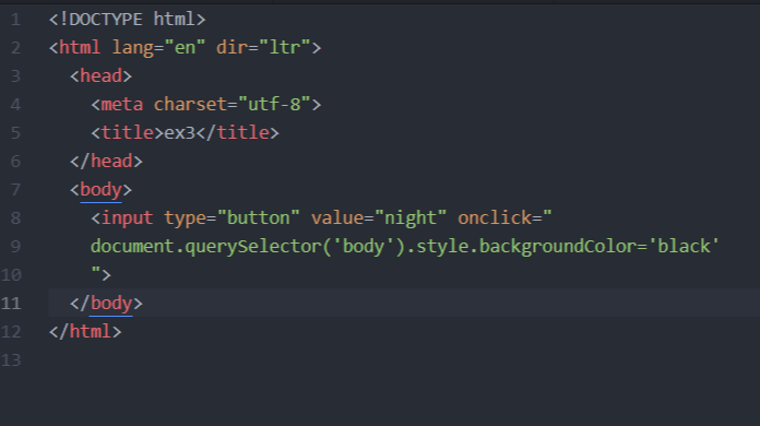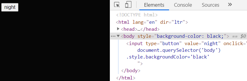 8. <input type="button" value="night" onclick="document.querySelector('body').style.backgroundColor = 'black' ;">