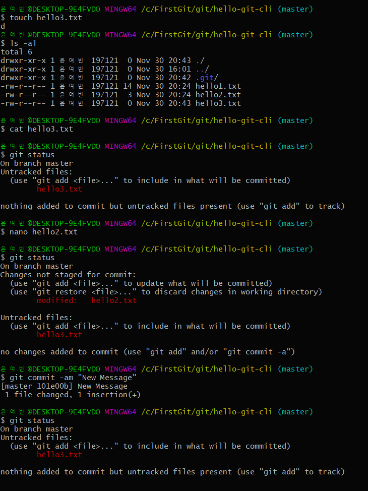 Untracked files 상태의 hello3.txt 파일을 볼 수 있다