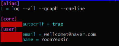 (2) - 상단에 [alias] L = log --all --graph --oneline 추가 작성 후 저장하고 나오기