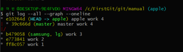 (5) - 그리고 git log를 살펴보면 HEAD가 apple을 가르키며 apple work 4버전이 새로 생겼고 이것은 work3 버전에서