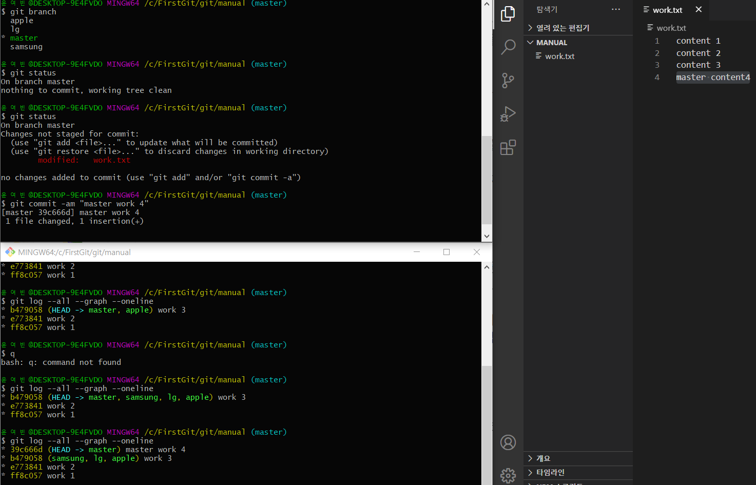 (4) - git commit -am 명령어로 add와 commit을 한번에 하여 master work 4라는 이름을 준다