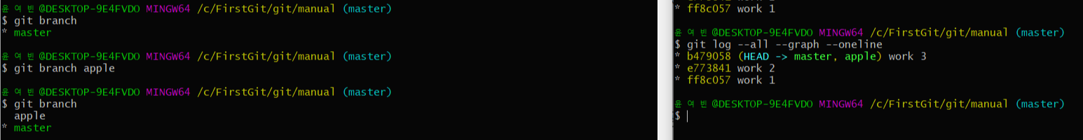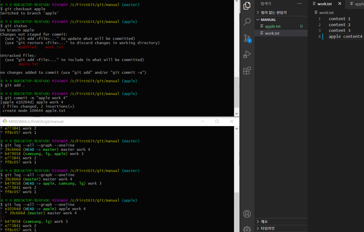 - git branch로 다시 확인해보면 apple이라는 branch가 생겼고 git log에도 apple이 추가 되었다.