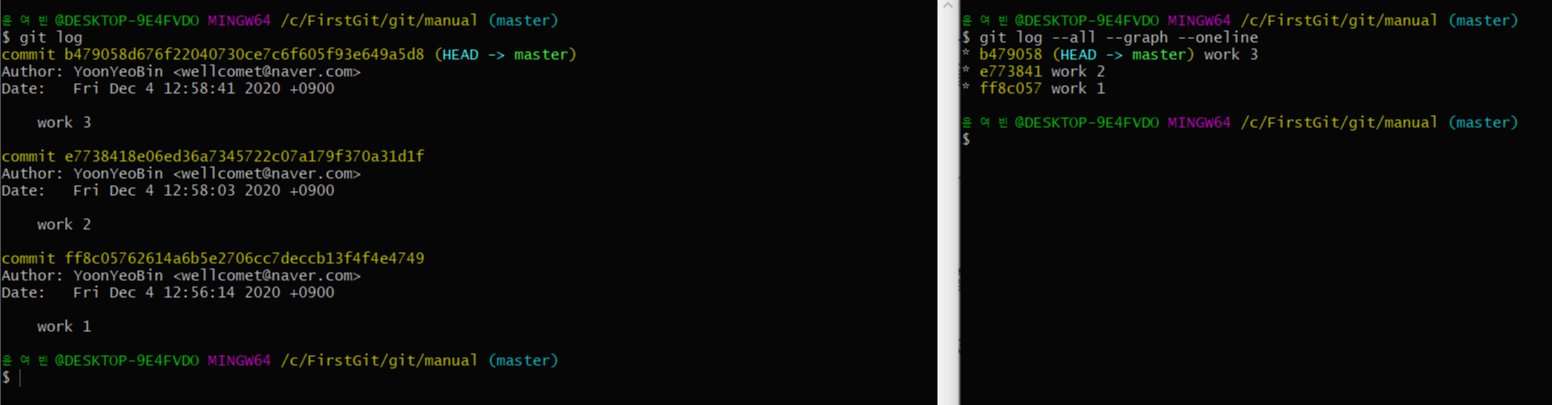 (5) - git log를 해보면 현재 브런치인 master브랜치만 따로 위에서 수정하고 커밋한 master work 4 버전을 가지고 있다