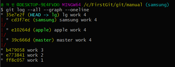 (2) - git log를 해보면 현재 git의 브런치상태가 HEAD -> master, samsung, lg, apple 상태인 것을 알 수 있다