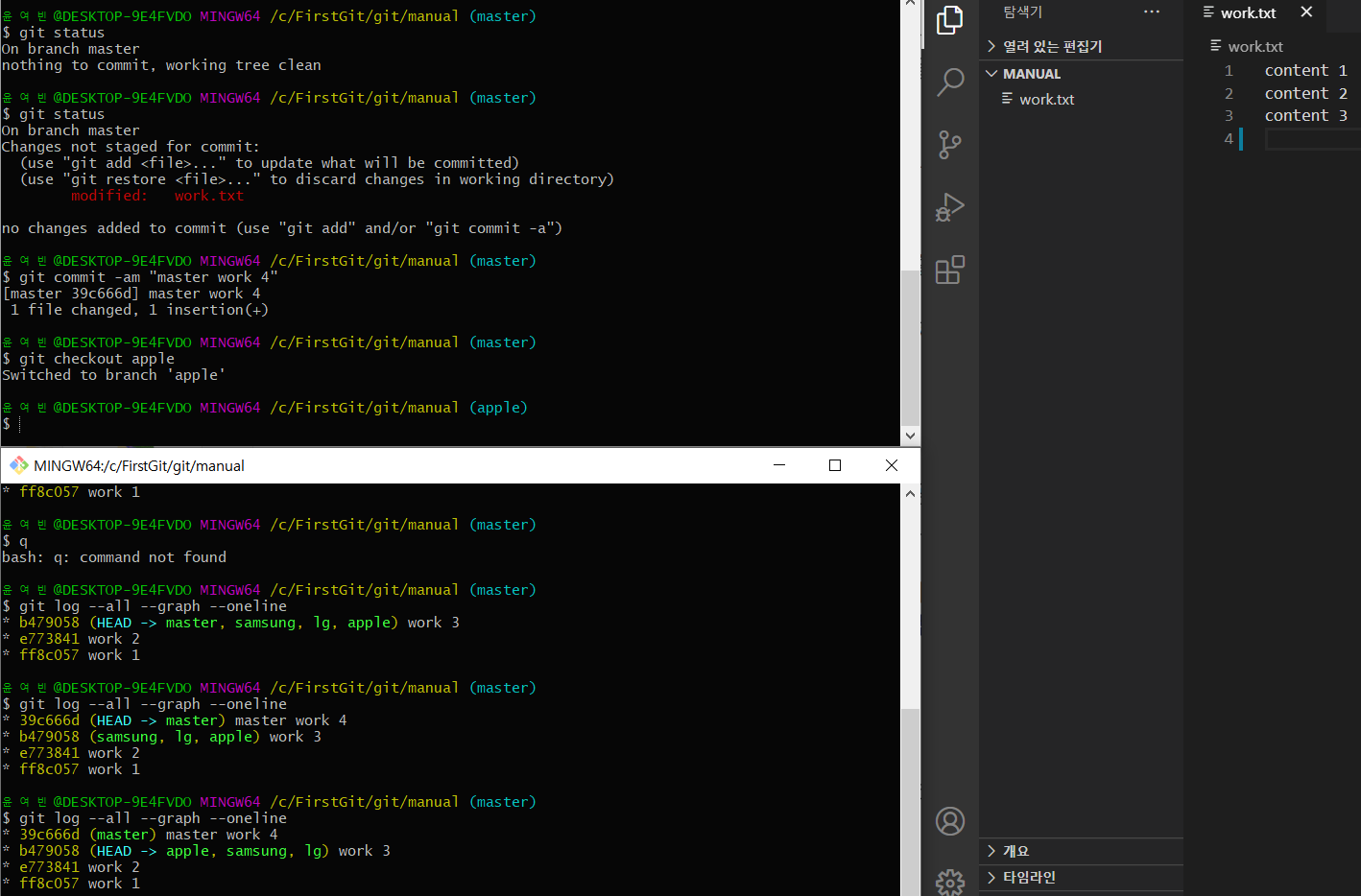 (2) - work 3버전에 머물러 있던 apple브런치의 work.txt파일에 apple content4 텍스트를 추가하고 apple.txt 파일도 추가로 생성한다