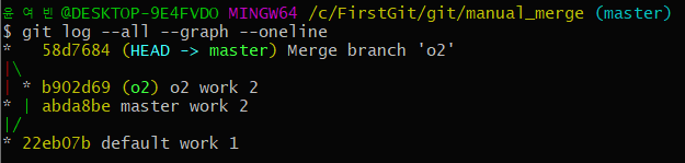 (2) - git merge o2를 하여 o2 브런치를 master 브런치에 병합 한다