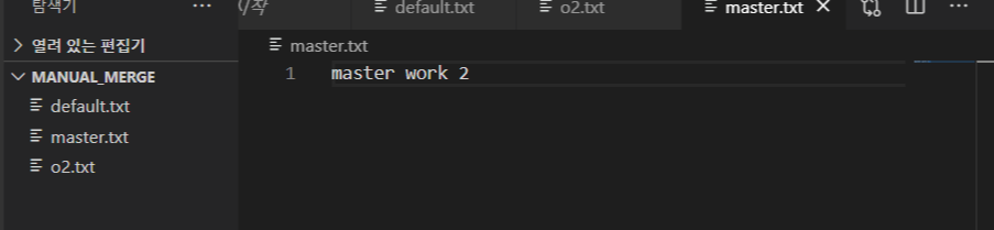 (3) - default work1 버전에서 파생되어 default.txt 파일과 master.txt파일을 가지고 있는 master work 2버전