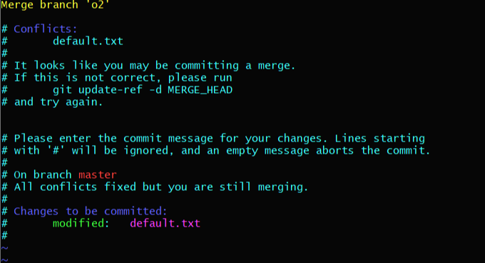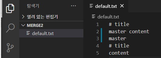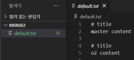 (8) - 병합된 새로운 default.txt 파일 버전이 생성됨 # title / master content # title / o2 content