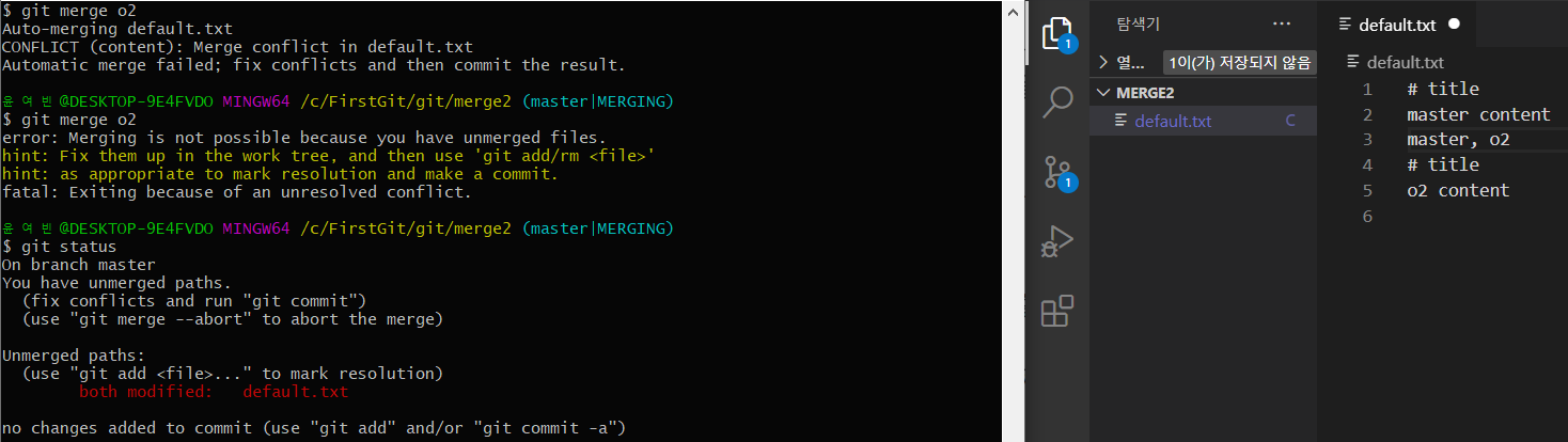 3.하나의 default.txt 파일에 2개의 branch로 각각의 변화를 주고 그 둘을 merge하기