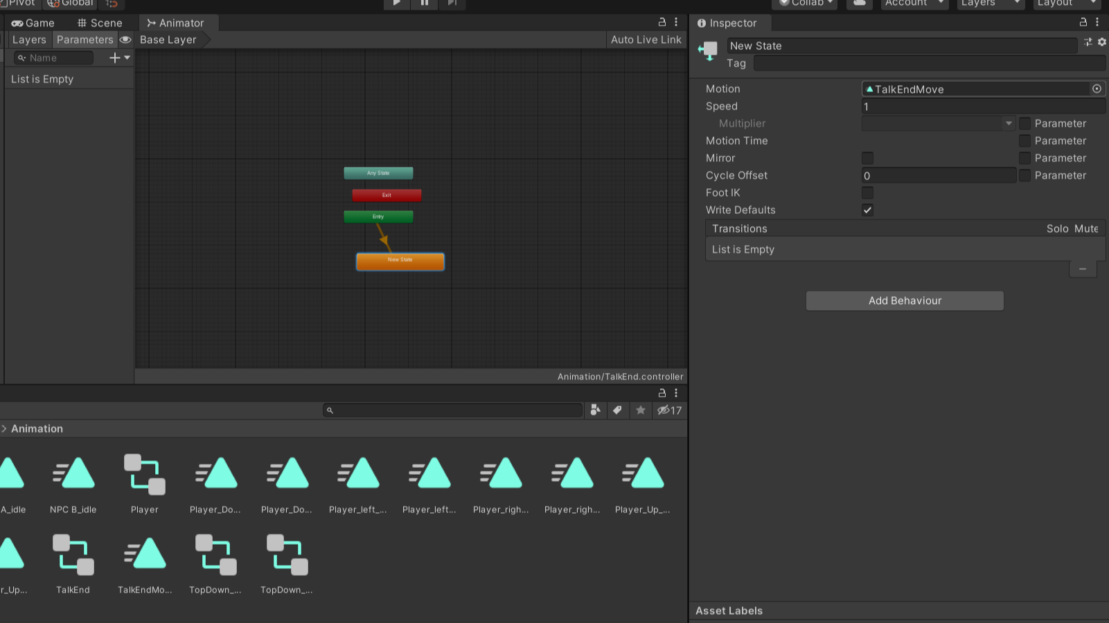 (6) 생성된 empty animation state 에 전에 생성한 비어있는 TalkEndMove animation 을 드래그앤 드랍