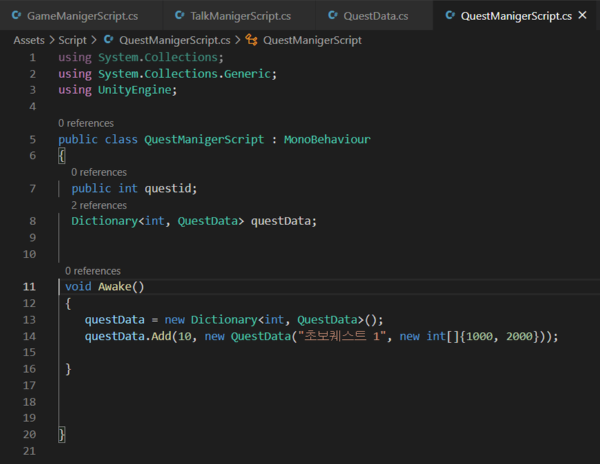 퀘스트이름, 퀘스트관련npc 정보를 QuestManigerScript에 만들어놓은 것임