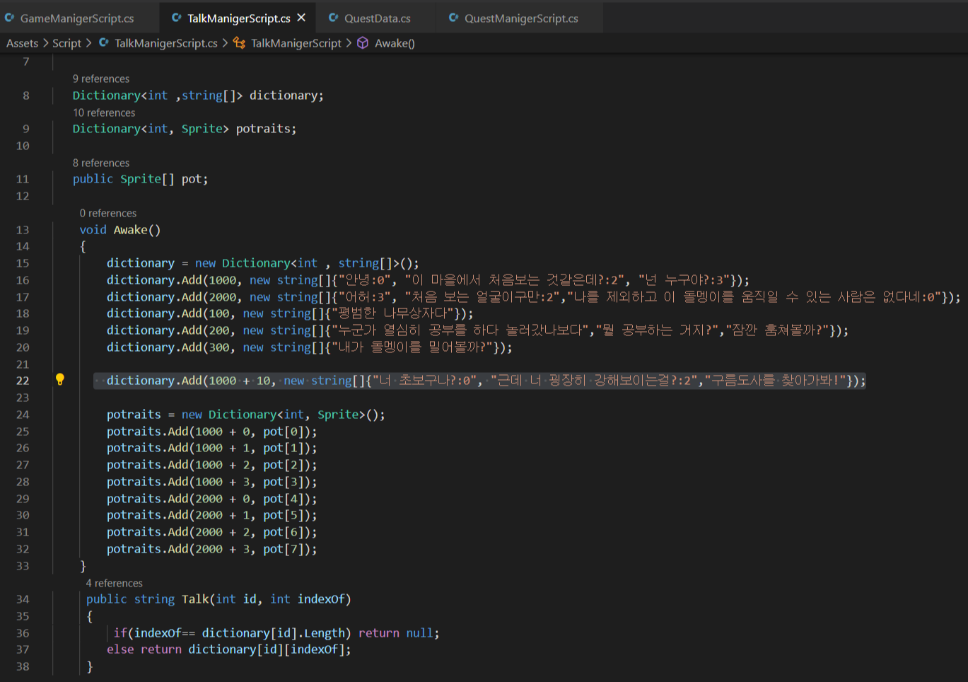 퀘스트id를 + 한 경우엔 퀘스트id와 관련된 또다른 talk 딕셔너리를 가져오도록 talk딕셔너리 데이터를 추가한다