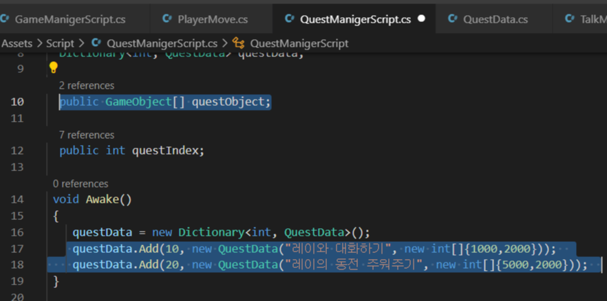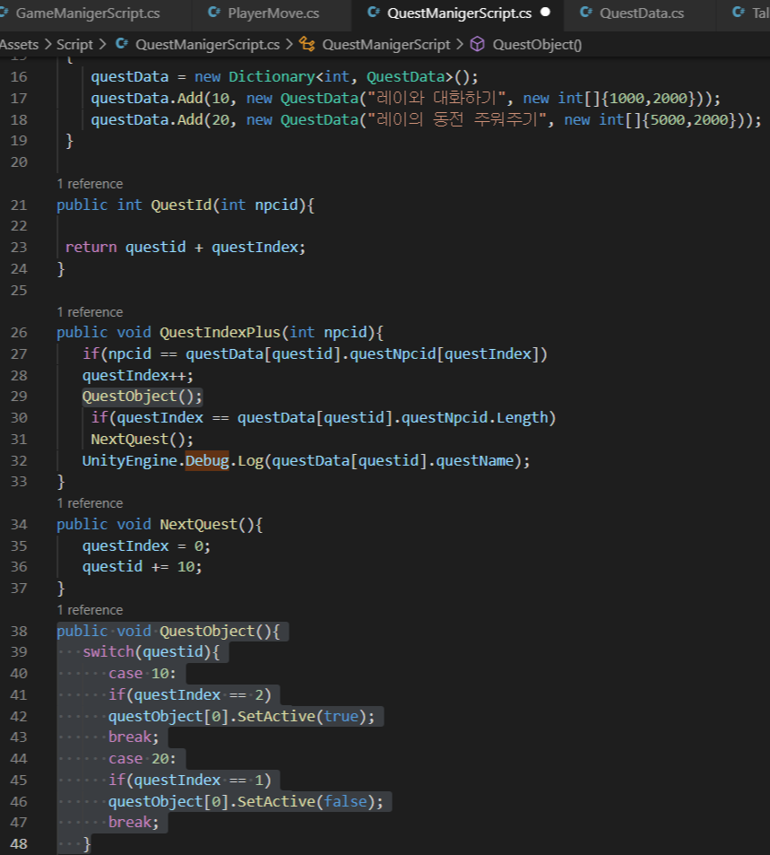 - 20번 퀘스트이면서 해당 동전(id 5000)과 대화를 하여 questIndex가 1로 증가하면 동전오브젝트를 비활성화