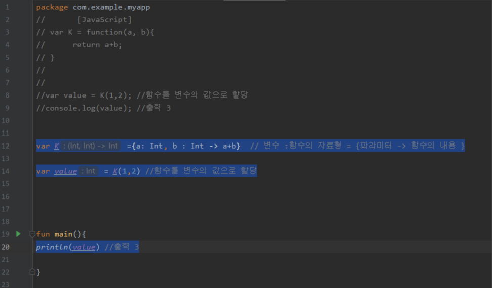 *var K : (Int, Int) -> Int = {a, b -> a+b} 혹은
