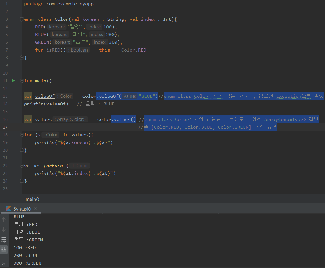 • enum class는 열거형 클래스로 현재상태를 구분하기 위한 객체들을 이름을 붙여 여러개를 생성해두고 그 중 하나의 상태를 선택하여 현재 상태를 나타내기위한 클래스이다