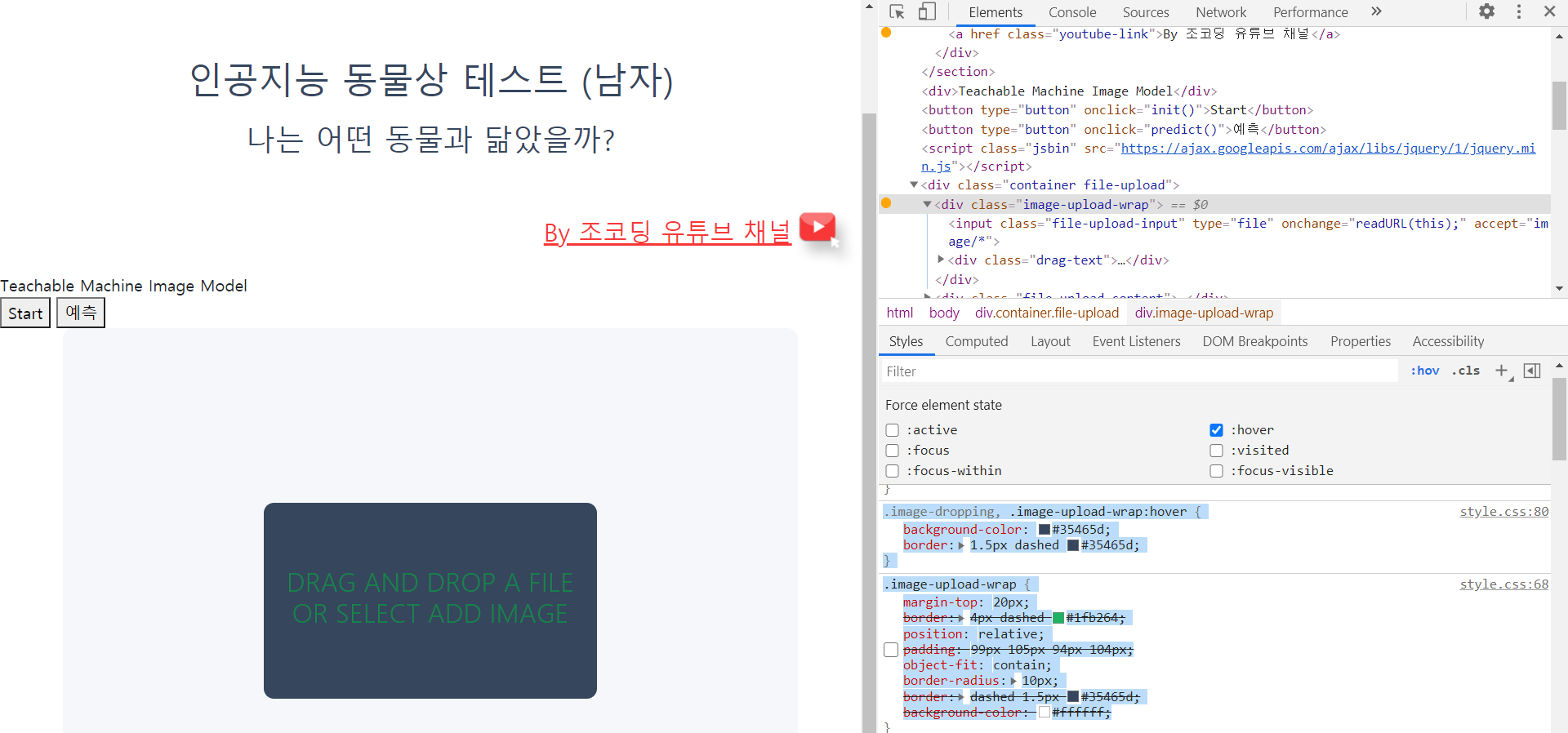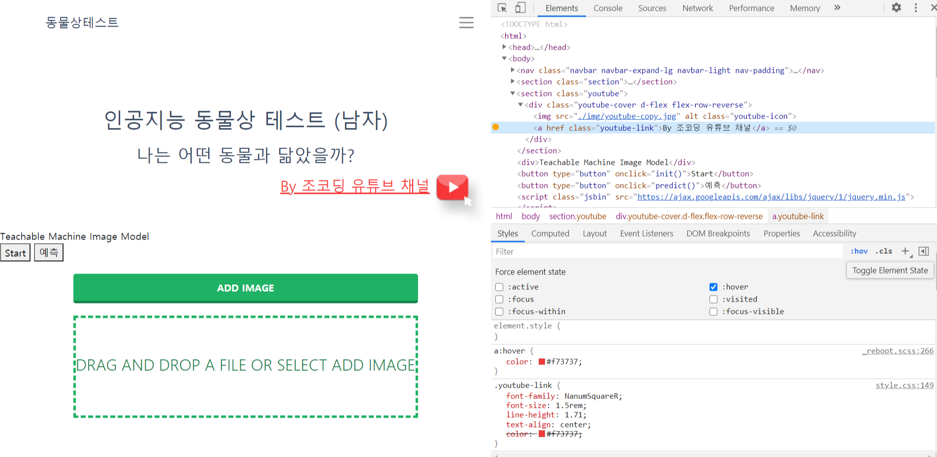 - By 조코딩 유튜브 채널 텍스트가 있는 a태그를 찾아서 개발자 도구의 Filter 우측 :hov를 클릭