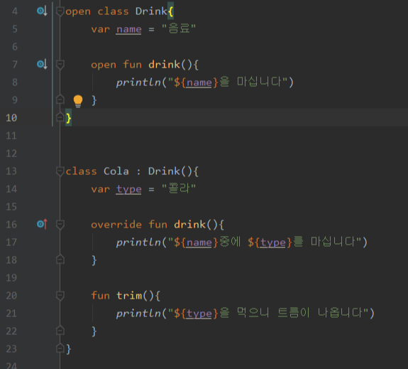 Drink클래스를 상속받아 Drink 클래스 본연이 가지고 있던 변수 name과 Drink 클래스의 open fun drink()을 override한 Cola클래스의 fun drink()