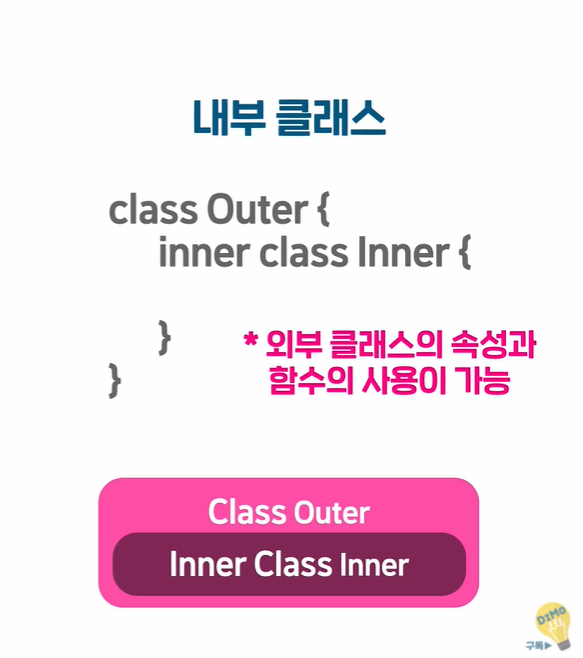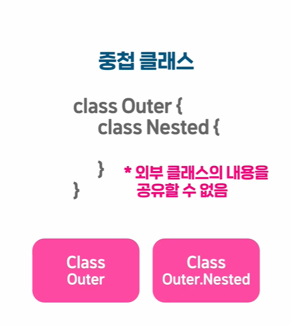 *중첩클래스와 내부클래스는 클래스간의 연계성을 표현하여 코드의 가독성 및 작성 편의성을 제공한다