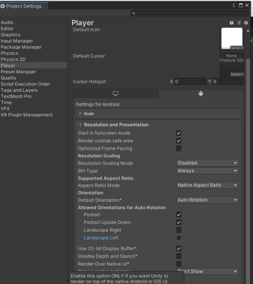 - 세로모드만 지원하기 위해서 가로모드인 Landscape는 체크해제 혹은 Default Orientation*의 값을