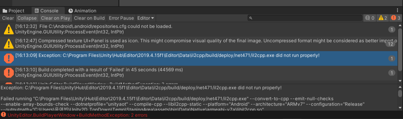 - 해당 유니티파일 경로에 한글이름이 있어서 그랬던 것.. 위치를 변경하여 재빌드하면 빌드 성공