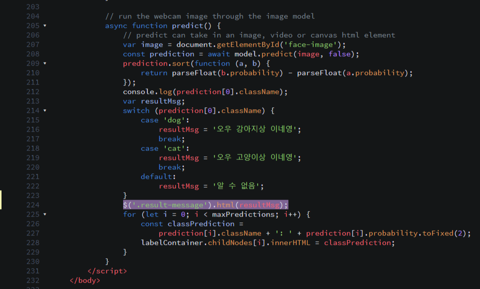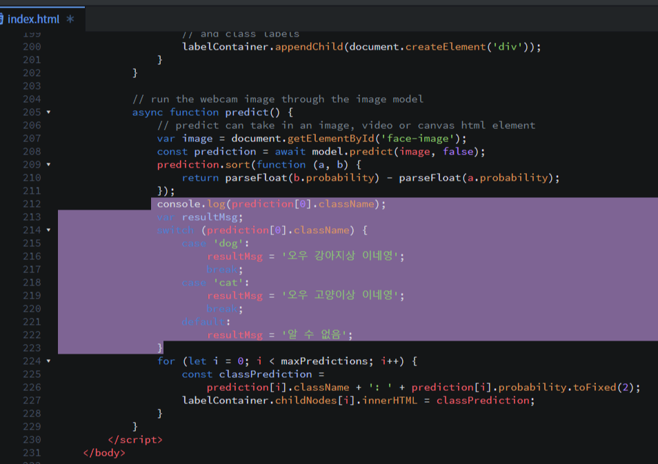 2. prediction[0].className으로 찾아낸 닮은%가 높은 동물이름이나 관련된 메세지를 사진이미지 바로 아래에 넣어보자