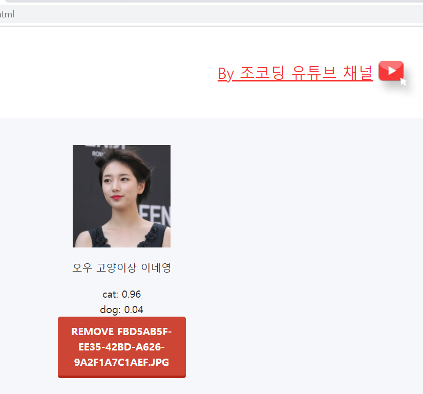 - 아래와 같이 이미지아래에 닮은꼴%가 높은 동물에 대한 메세지가 나오는걸 볼 수있다