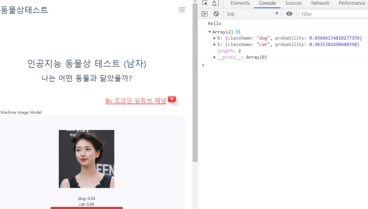 때문에 prediction[0].className은 닮은%가 높은 닮은꼴 동물이름이 오게 된다