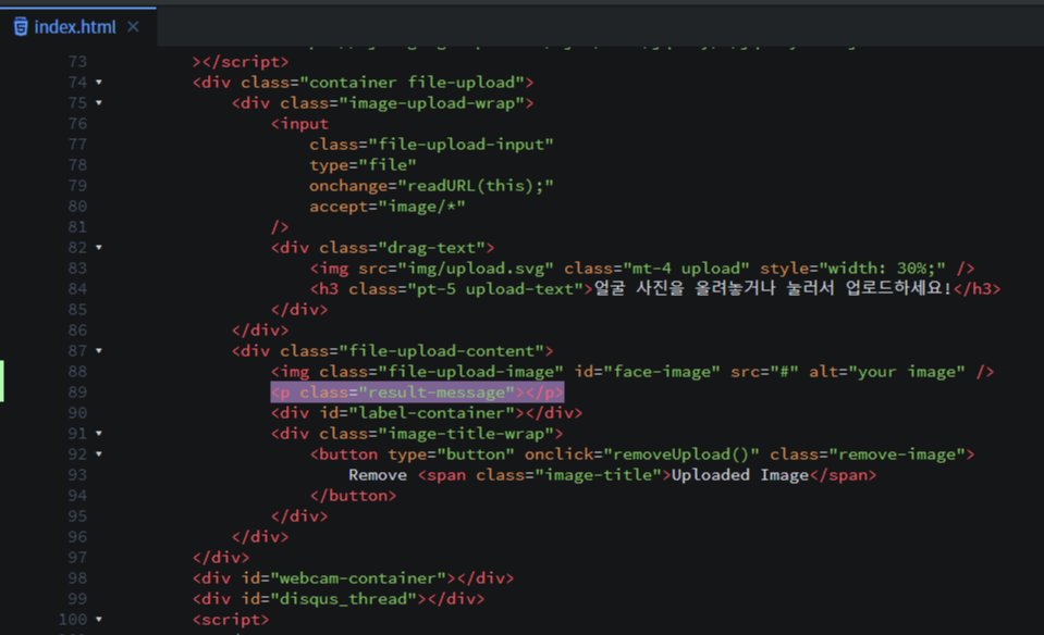 - 담은 변수를 저장할 p태그를 만들어 result-message라는 class 이름을 주고 이미지태그와