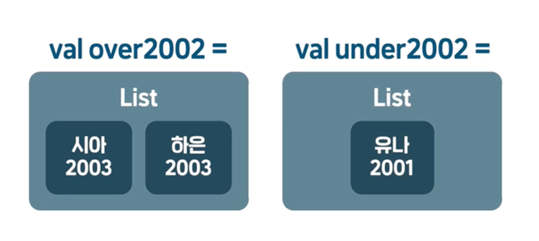 : 아이템에 조건을 걸어 true인지 false인지에 따라 두 컬렉션으로 나누는데