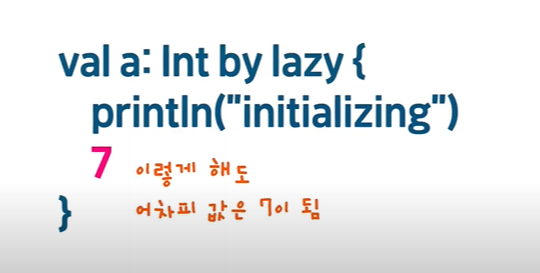 이처럼 변수 선언 val(var x)와 자료형 뒤에 by lazy{ 할당값 } 형태로 쓰이며 람다함수{}를 활용한다