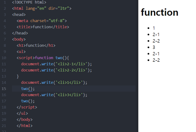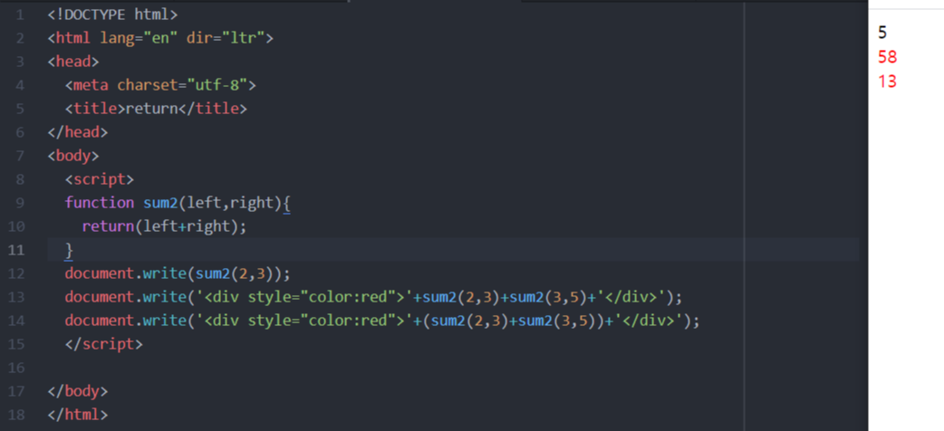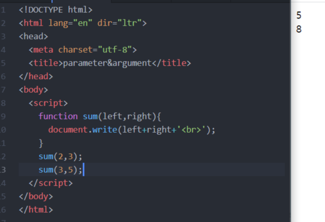 예제2에서의 sum함수는 sum(2,3);라는 코드만 작성 하면 sum함수가 document.write(left+right+'<br>')이기 때문에