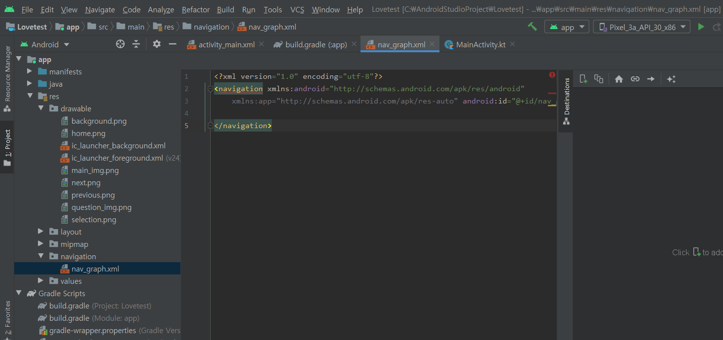 - nav_graph.xml 이 생성되는데 이것은 네비게이션상태를 눈으로 볼수 있게 GUI로 보여주는 것