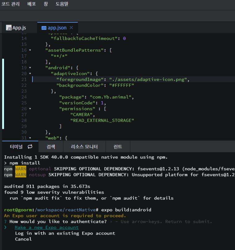 - app.json의 안드로이드 속성안에 코드추가(카메라, 앨범 권한)