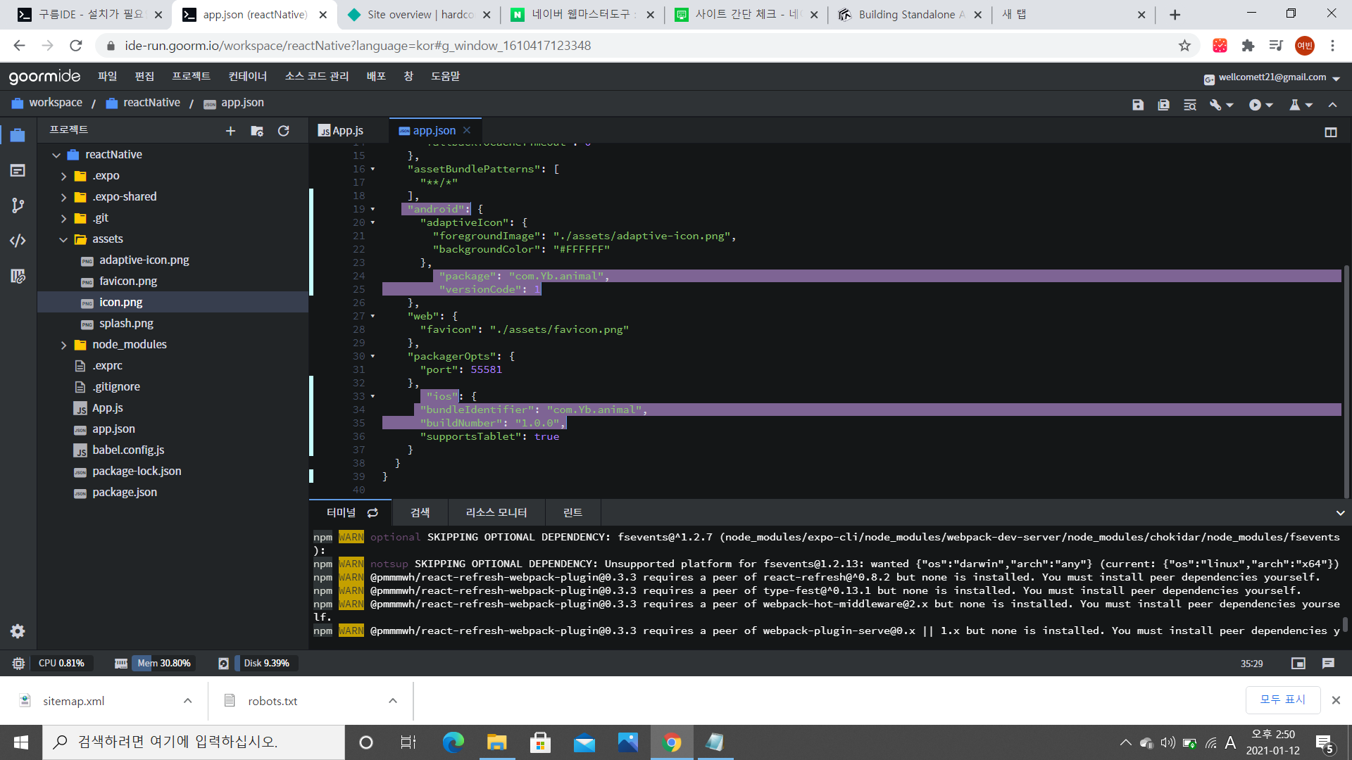 3)ios와 android에 대한 정보를 복사하여 app.json에 붙여넣기