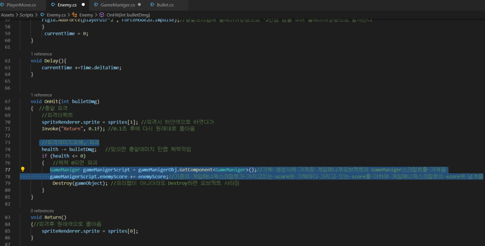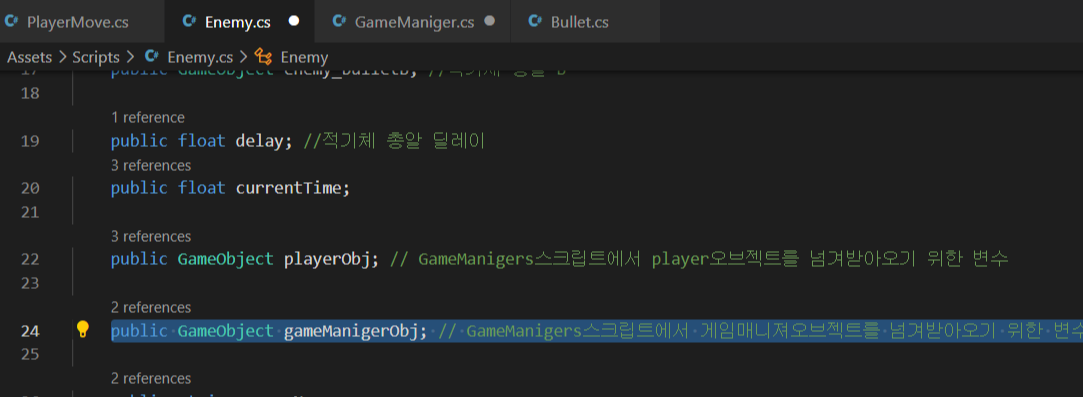 Enemy스크립트에서 (1)로 부터 받아올 게임매니져의 오브젝트를 받을 수 있게 public GameObject 선언을 해주고