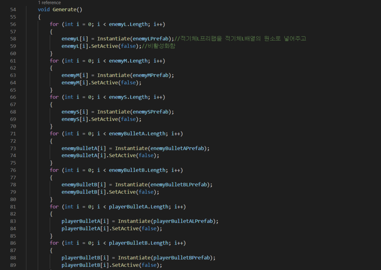 - 아래는 배열의 크기를 정해주고 그 크기만큼의 프리팹을 비활성화상태로 생성해두며