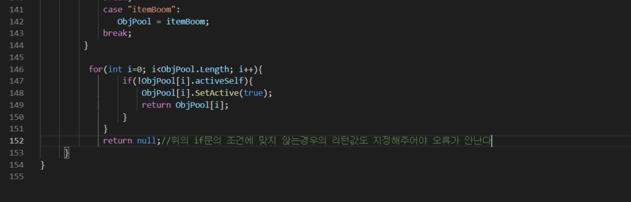 - MakeObj()이라는 함수를 다른 스크립트에서 사용함으로 인해 1회 사용시마다 타입에 따라 1개의 비활성화된 상태로 존재하고 있던 오브젝트를 활성화 시키는 형식으로 사용한다