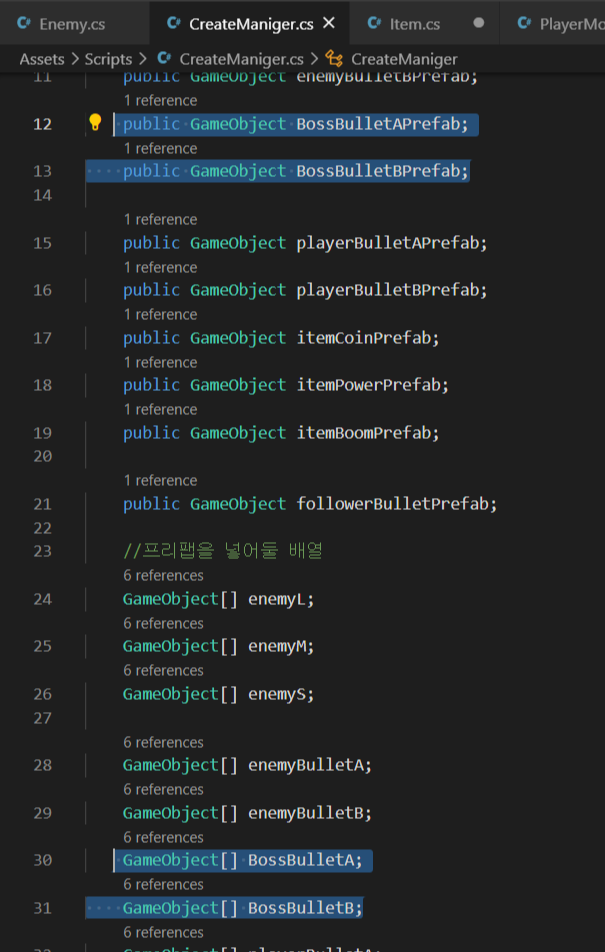 - 보스 오브젝트에 Enemy스크립트를 주고 보스와 관련된 코드를 추가로 구현해 준다