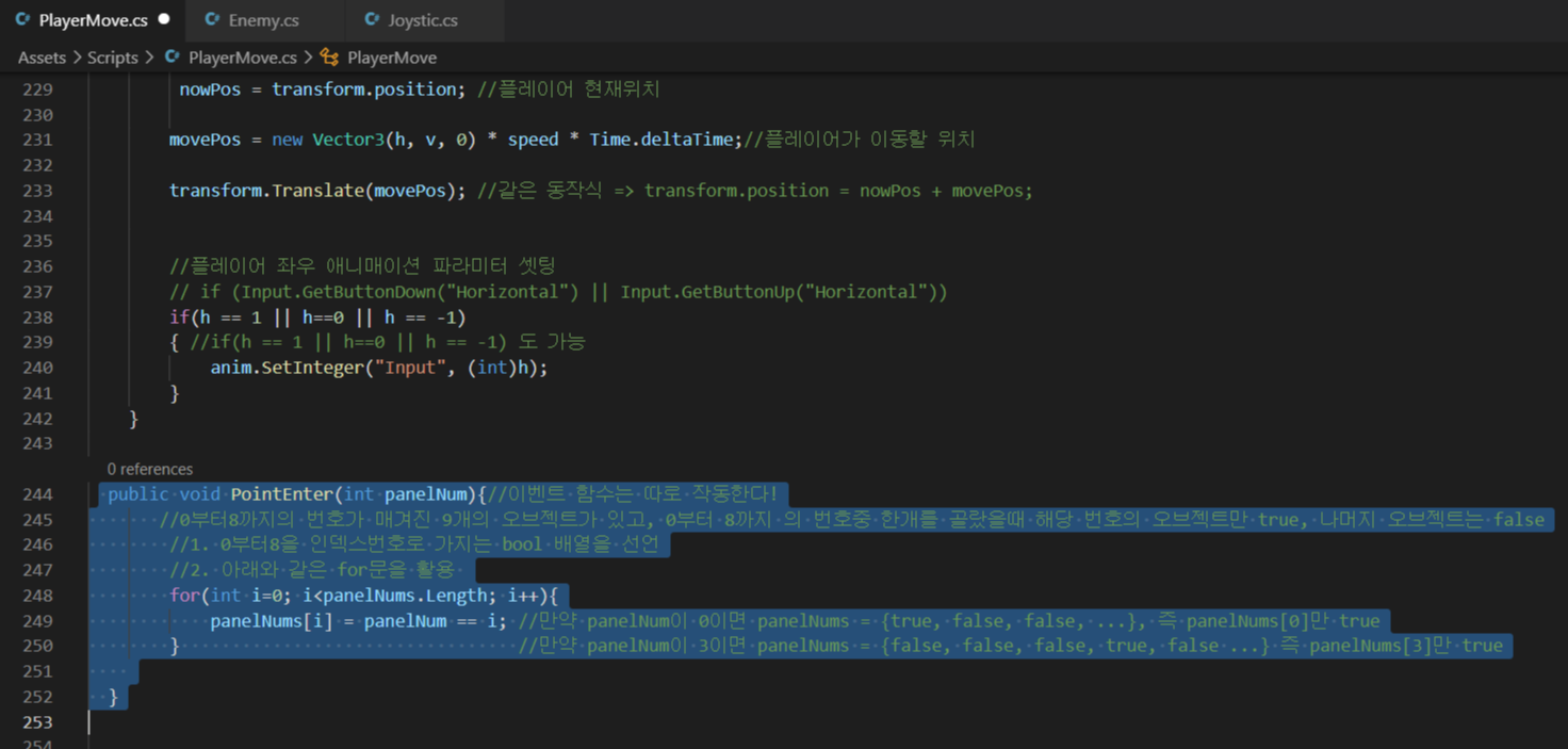 - Pointer Up과 Pointer Down을 사용하여 우리가 클릭을 하고 조이판넬을 드래그할때만 이동동작하도록 만듬