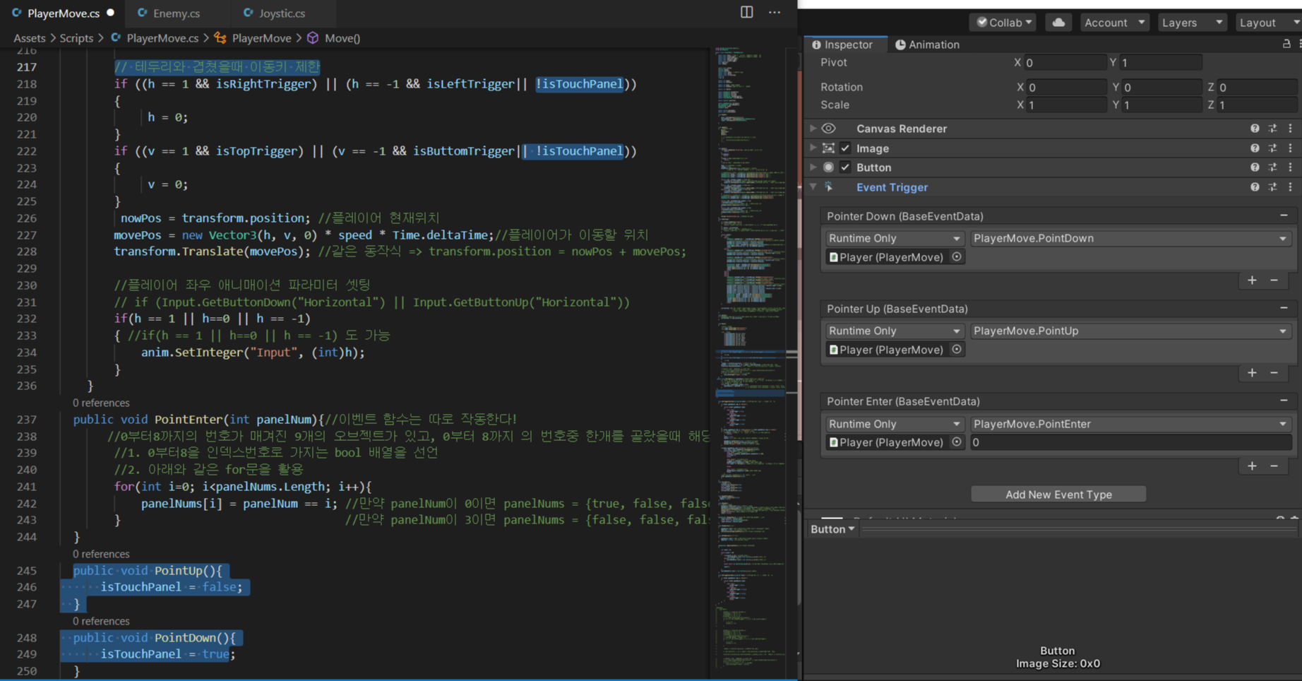 - Pointer Up과 Pointer Down을 사용하여 우리가 클릭을 하고 조이판넬을 드래그할때만 이동동작하도록 만듬