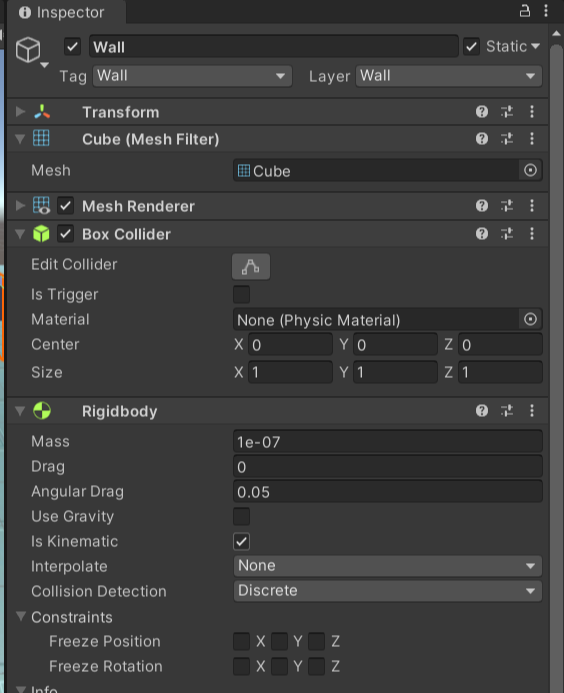 - physic material 를 생성하여 마찰과 탄성을 0으로 만들고 마찰결합도 최소로 만든 후 벽 오브젝트에 드래그 앤 드랍
