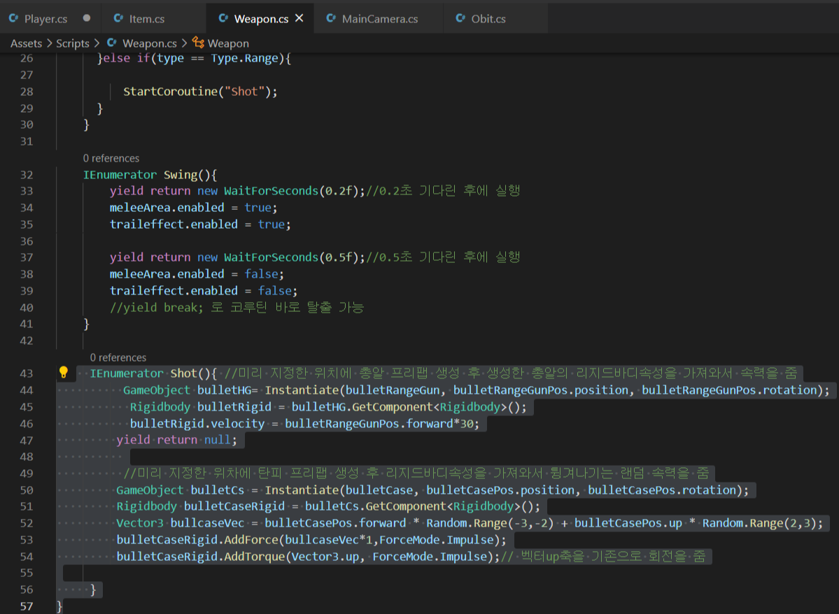 - 탄피가 튕겨 나가 : 탄피 프리팹 생성 instate, 탄피 프리팹 생성될 위치, 리지드 바디 랜덤속력 또는 랜덤힘을 주어 랜덤방향으로 나아감, + 힘을주어 회전