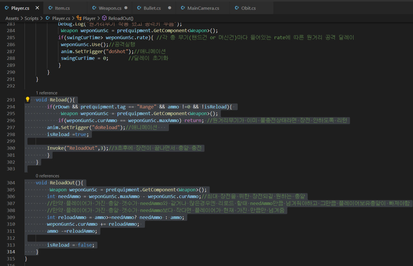 - 아래로 떨어지고, 탄피 사라짐 : 탄피에 리지드바디로 중력 적용, 마지막에 destroy